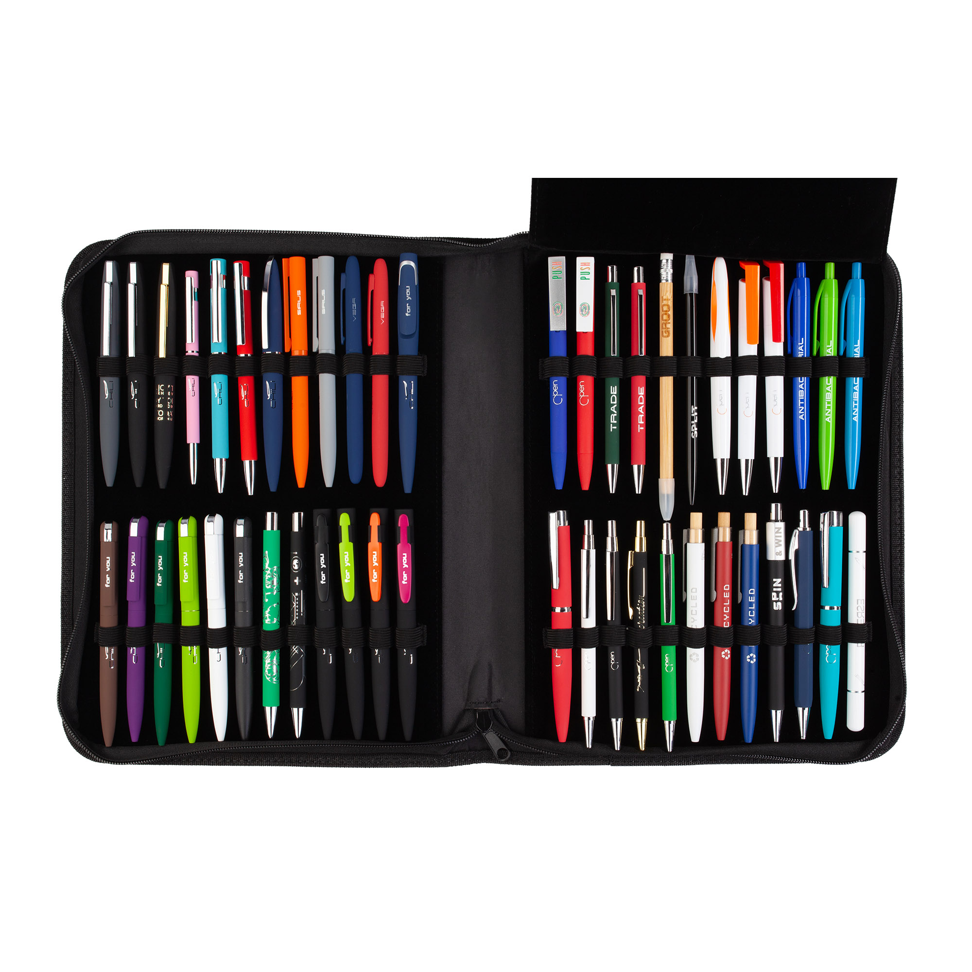 Презентационный кейс на 48 ручек и карандашей с разнообразными видами нанесения, включая зеркальную гравировку, гравировку по металлу и бамбуку, тампопечать, 3D-УФпечать.