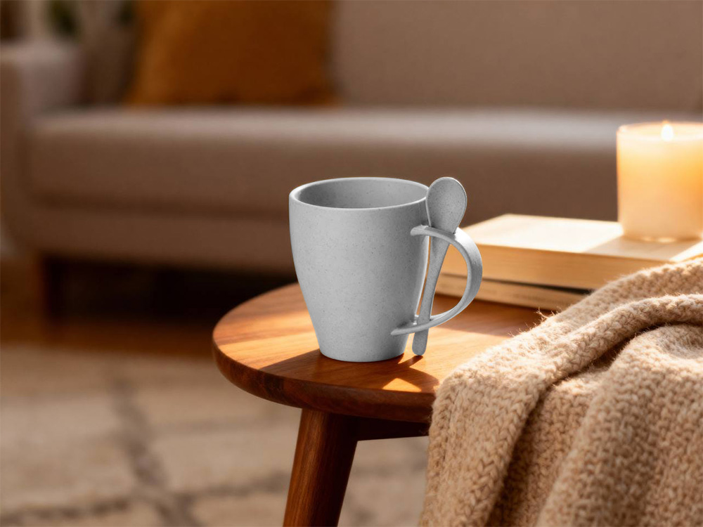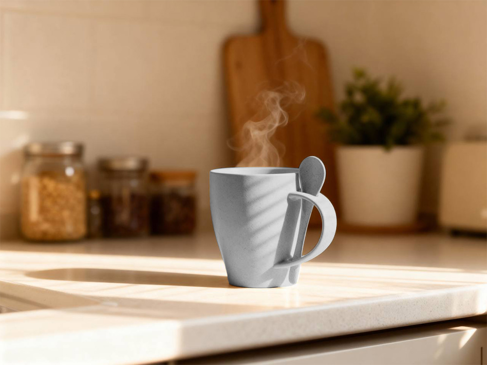 Кружка Nina состоит из смеси ПП-пластика (50%) и переработанной пшеницы (50%), что делает ее настоящим экомерчем. Поверхность кружки имеет приятный бежевый оттенок с небольшими вкраплениями-точками темно-серого цвета, которые только подчеркивают природное происхождение Nina.