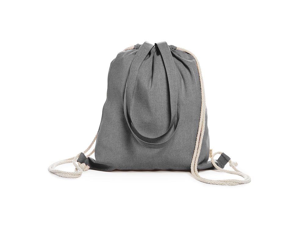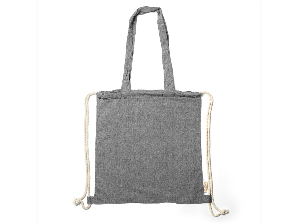 Рюкзак-мешок из переработанного хлопка плотностью 140 г/м? с меланжевой отделкой, ручками длиной 70 см в тон и шнурками натурального цвета.