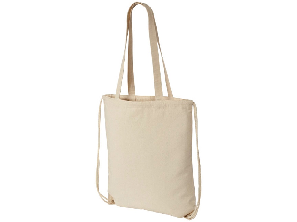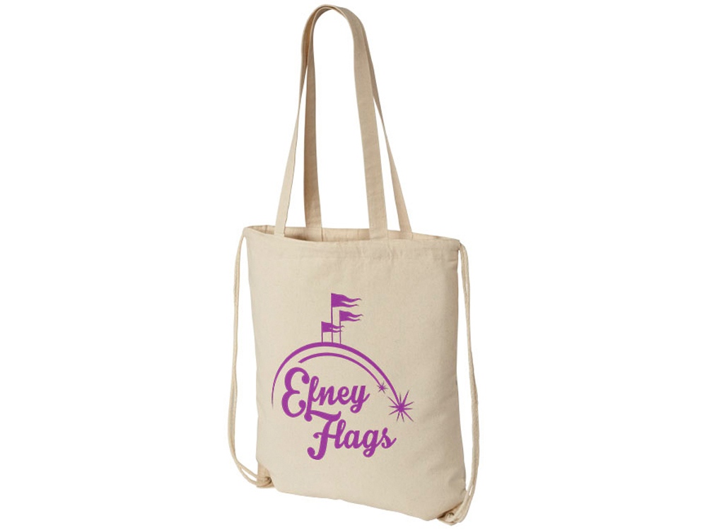 Многофункциональный хлопчатобумажный мешок с длинными ручками и затягивающим шнурком, который можно носить в качестве сумки для покупок или рюкзака. Большой основной отсек, закрывающийся затяжкой шнурка. Имеет две выпадающие ручки длиной 31 см. Вместимость: 16 л, выдерживает до 5 кг веса. Хлопок, 240 g/m2.
