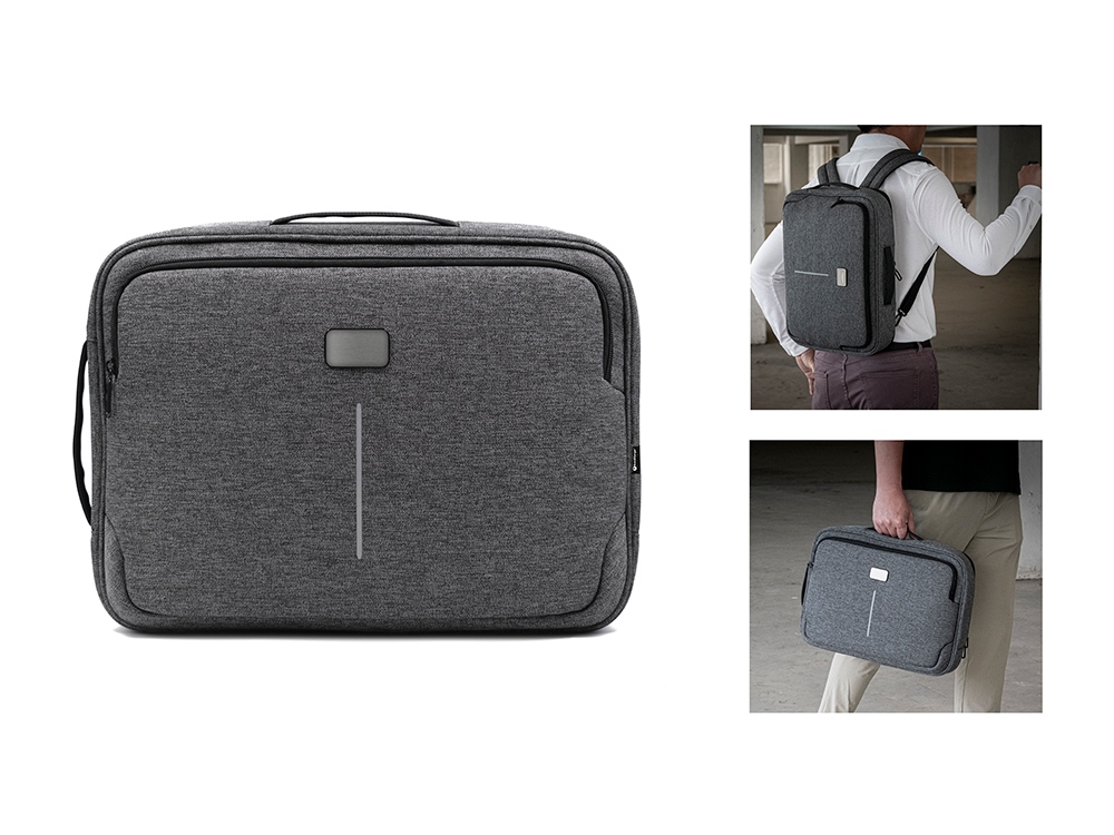 Рюкзак легко трансформируется в сумку для деловых поездок. Отстегивающиеся лямки можно спрятать в карман на молнии на спине. В комплекте 2 шильда под нанесение: металлический и из искусственной кожи.