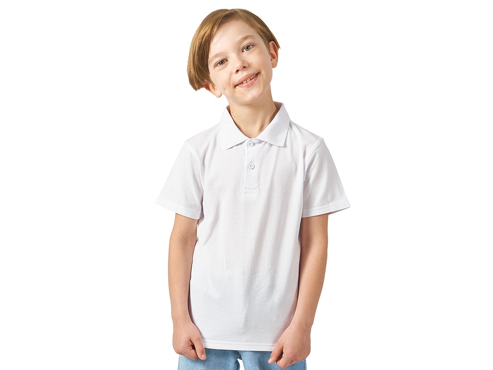 Детская рубашка поло First. Воротник 1х1. Обшивка внутри воротника. Мужская и детская модели с 2 пуговицами, женская - с 4 пуговицами. Пуговицы с гравировкой в тон. Пике, 100% хлопок. 160 г/м?.