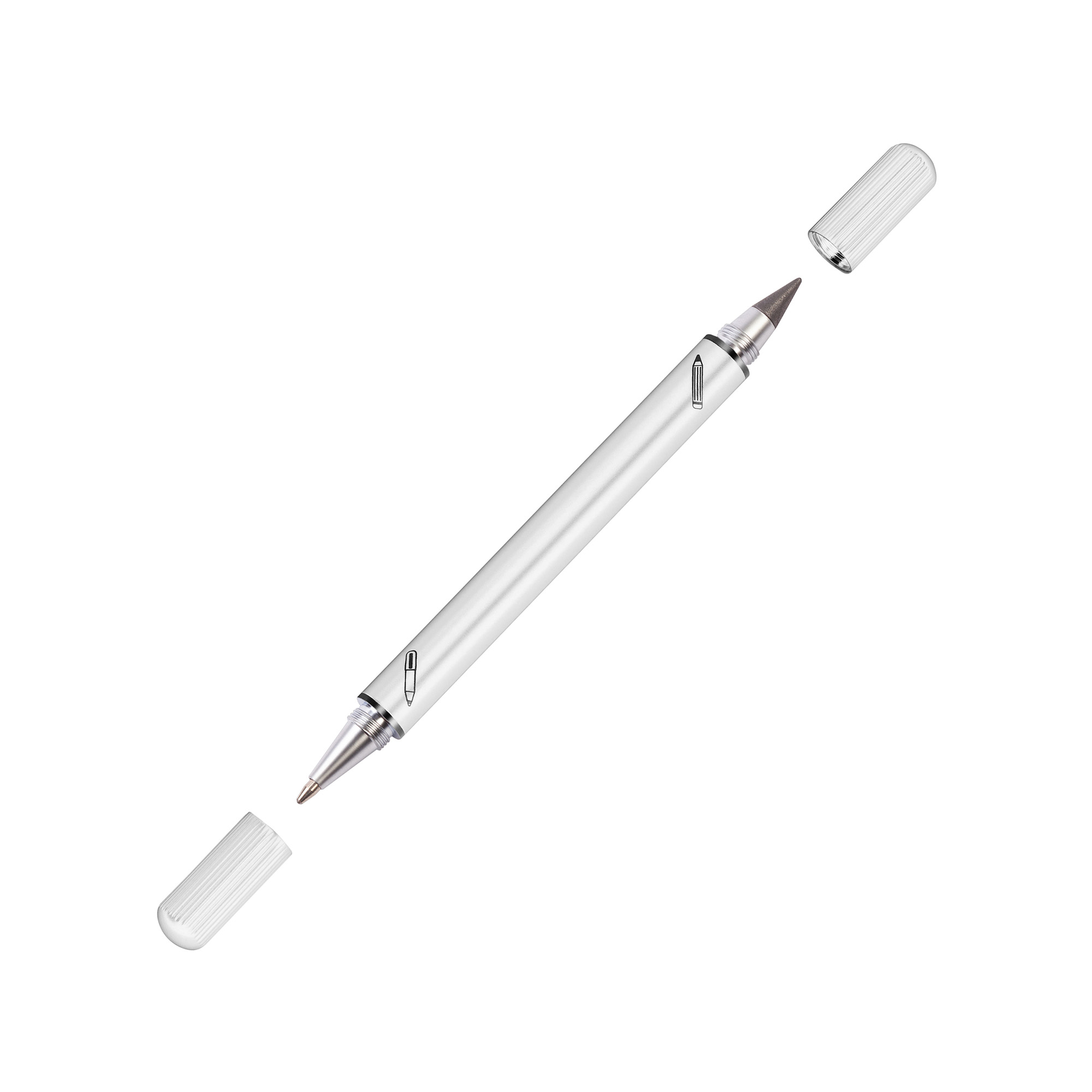 Набор из 2х письменных принадлежностей в едином корпусе - шариковой ручки и вечного карандаша, грифель которого выполнен из сверхпрочного графита с длиной письма до 30 000 метров, Закручивающиеся колпачки надёжно сохраняют пишущие узлы от внешних воздействий.