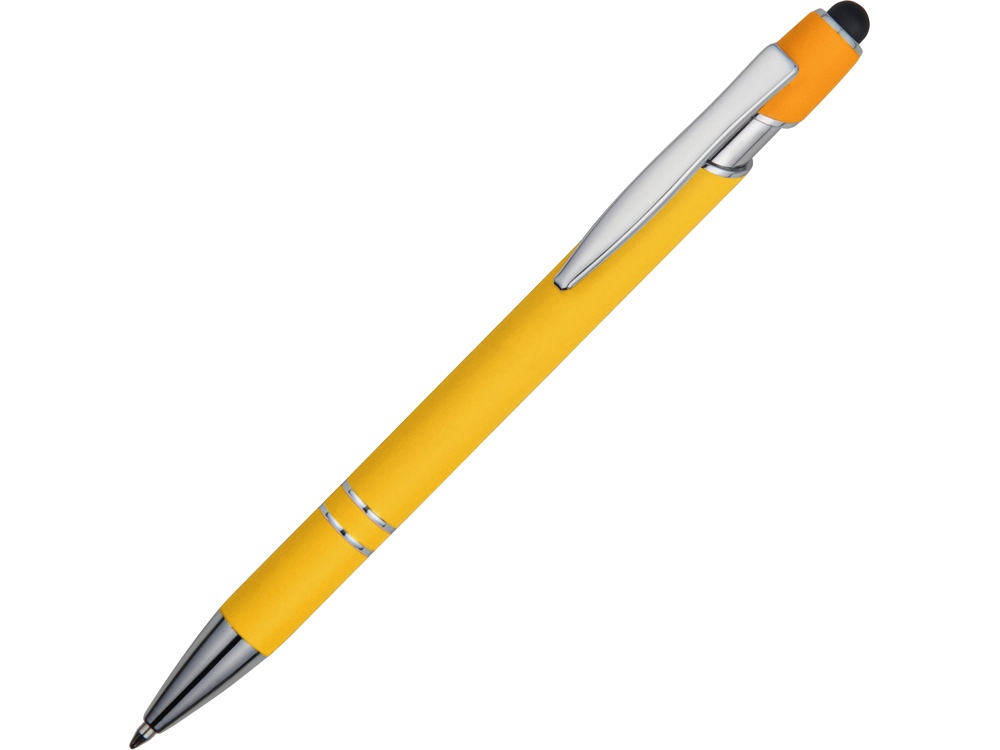 Ручка металлическая soft-touch шариковая со стилусом Sway, желтый/серебристый с логотипом компании - отличный способ заявить вашу корпоративную идентичность.