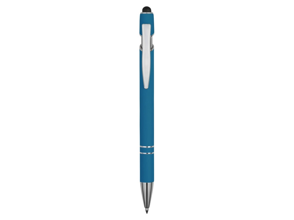 Ручка металлическая soft-touch шариковая со стилусом Sway, синий/серебристый с логотипом компании - отличный способ заявить вашу корпоративную идентичность.