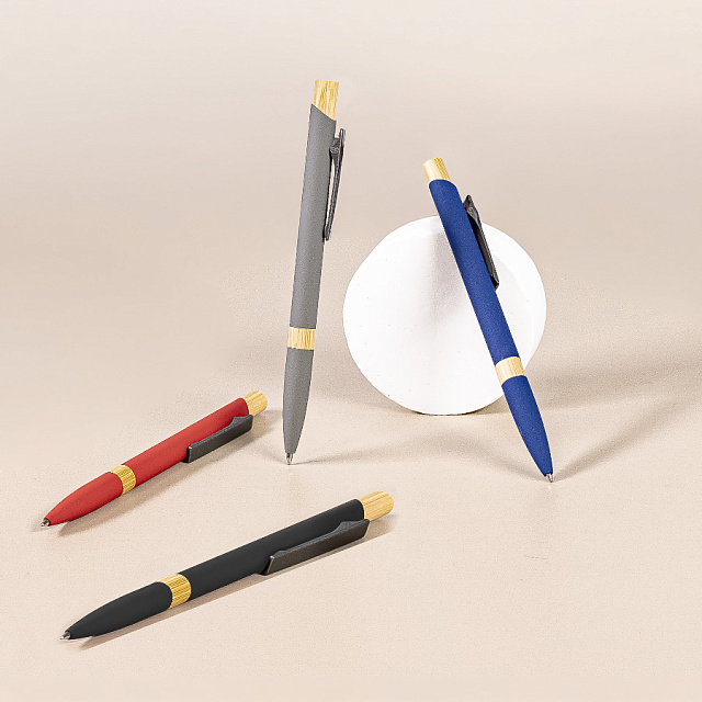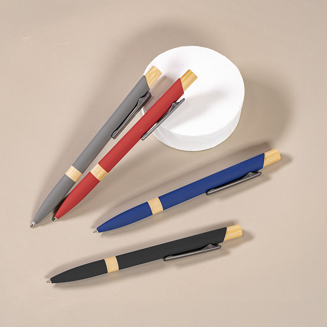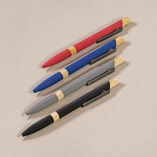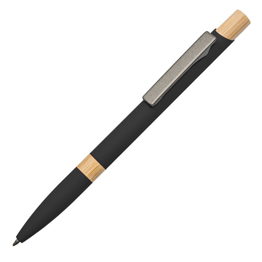 Экстравагантная модель ручки FRESCO. Корпус алюминиевый с матовым покрытием soft touch - ручку приятно держать в руке. Металлический клип-прищепка является эксклюзивом бренда В1. Отделка из натурального бамбука добавляет модели оригинальность. Кнопка нажимного механизма оптимального диаметра удобна для подушечки пальца. Визуально ручка выглядит очень благородно. В использовании гарантированно комфортна. • Цвет, близкий к Pantone Black • Размер ? 10 x 140 мм • Корпус из алюминия с покрытием soft touch • Металлический клип-прищепка • Отделка - бамбук • Нажимной механизм подачи стержня • Пулевидный пишущий узел 1.0 мм • Длина линии письма 800-1000 м • Чернила Dokumental, цвет чернил синий • Сменный стержень Parker type • Виды нанесения: гравировка