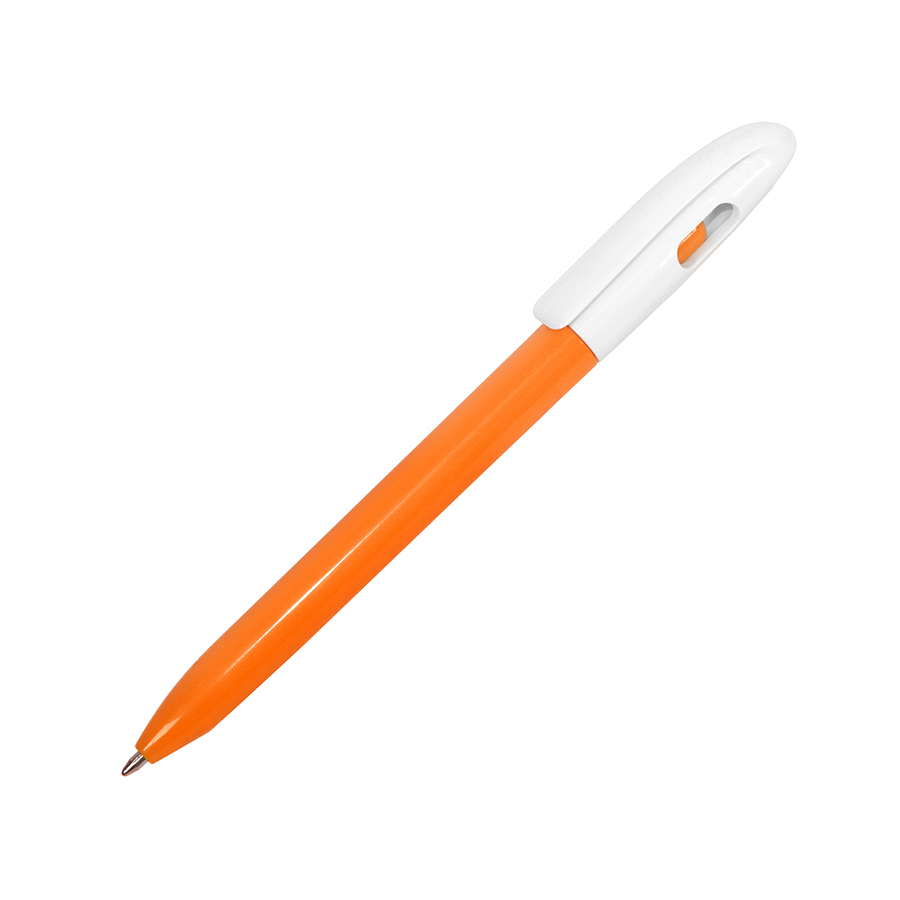 Ручка обтекаемой формы с поворотным механизмом и оригинальной деталью: когда стержень в нерабочем положении, цветная внутренняя кнопка полностью закрывает окошко в верхней части ручки, а когда стержень выдвинут - окошко наполовину открыто.