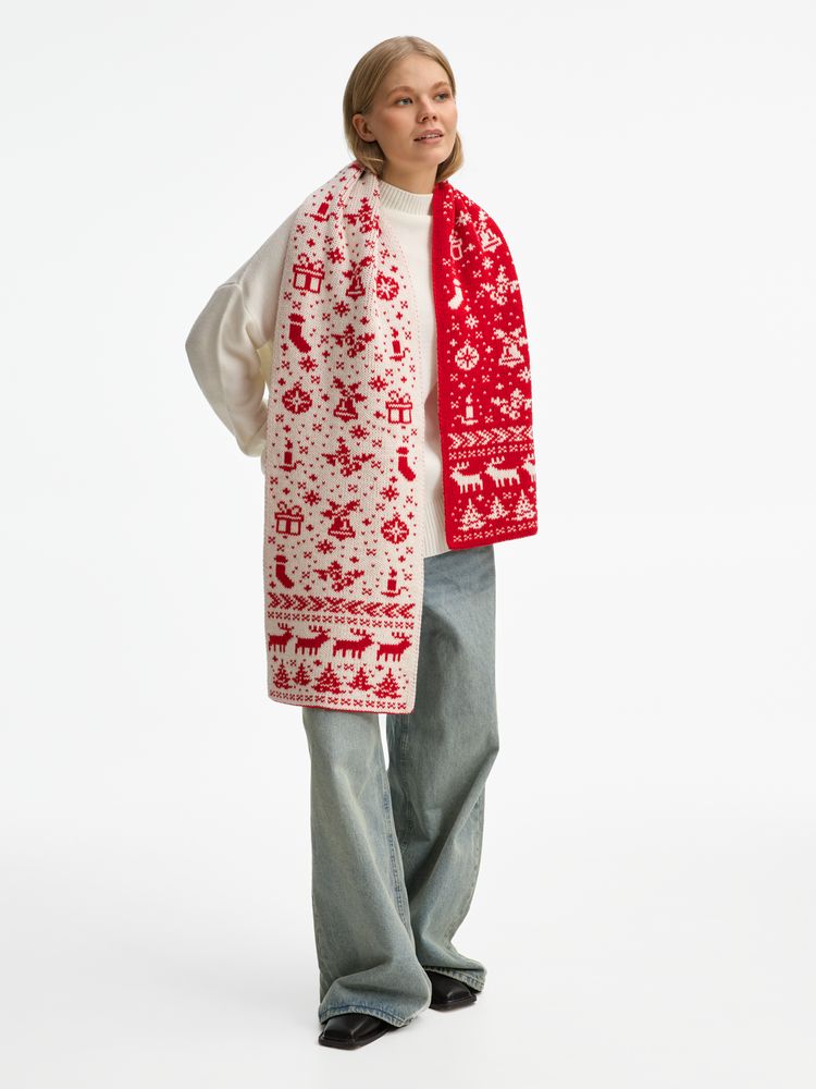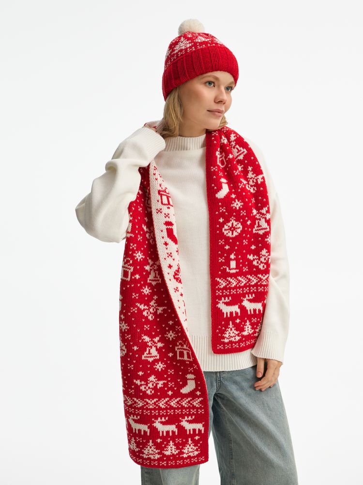 Шарф Holidale выполнен из высокообъемной полушерстяной пряжи, которая дарит тепло и ощущение праздничного уюта. Изысканный жаккардовый узор в традиционных зимних цветах, контрастные сочетания и объемная текстура подчеркивают праздничный характер аксессуара.