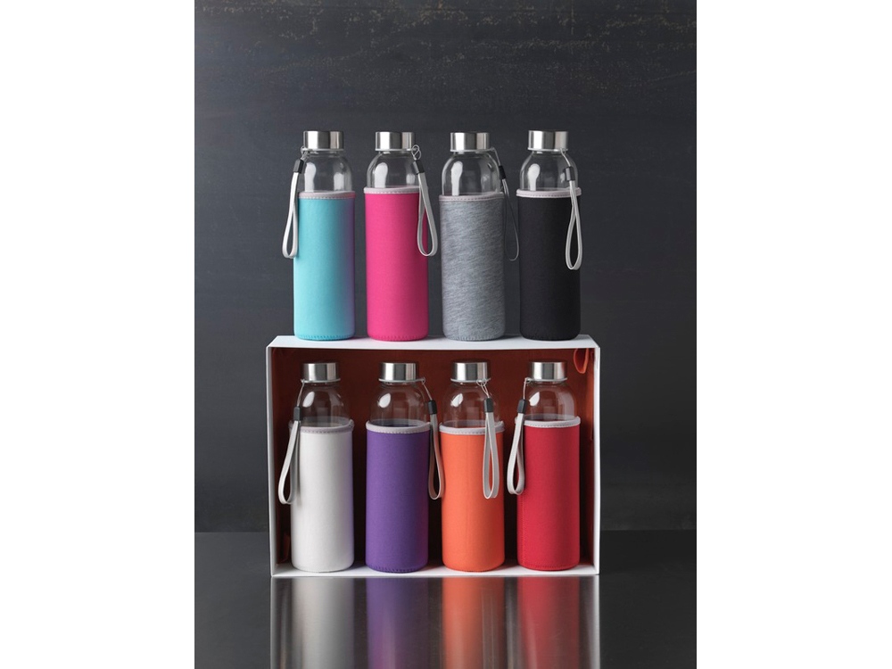 Стеклянная бутылка с одинарными стенками и съемной крышкой. На крышке есть ремешок для легкой переноски, кроме того имеется чехол из неопрена. Рекомендуется использовать для холодных напитков. Не замораживать, не разогревать в микроволновой печи. Объем 500 мл. Уложена в подарочную коробку.