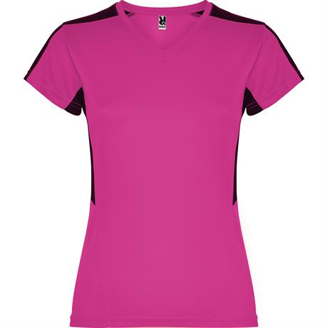 Поставщик корпоративных сувениров и подарков «Эклектика BY» осуществляет нанесение логотипа на сувенирную продукцию: Спортивная футболка SUZUKA женская, ФУКСИЯ/ЧЕРНЫЙ S. Арт. 202347