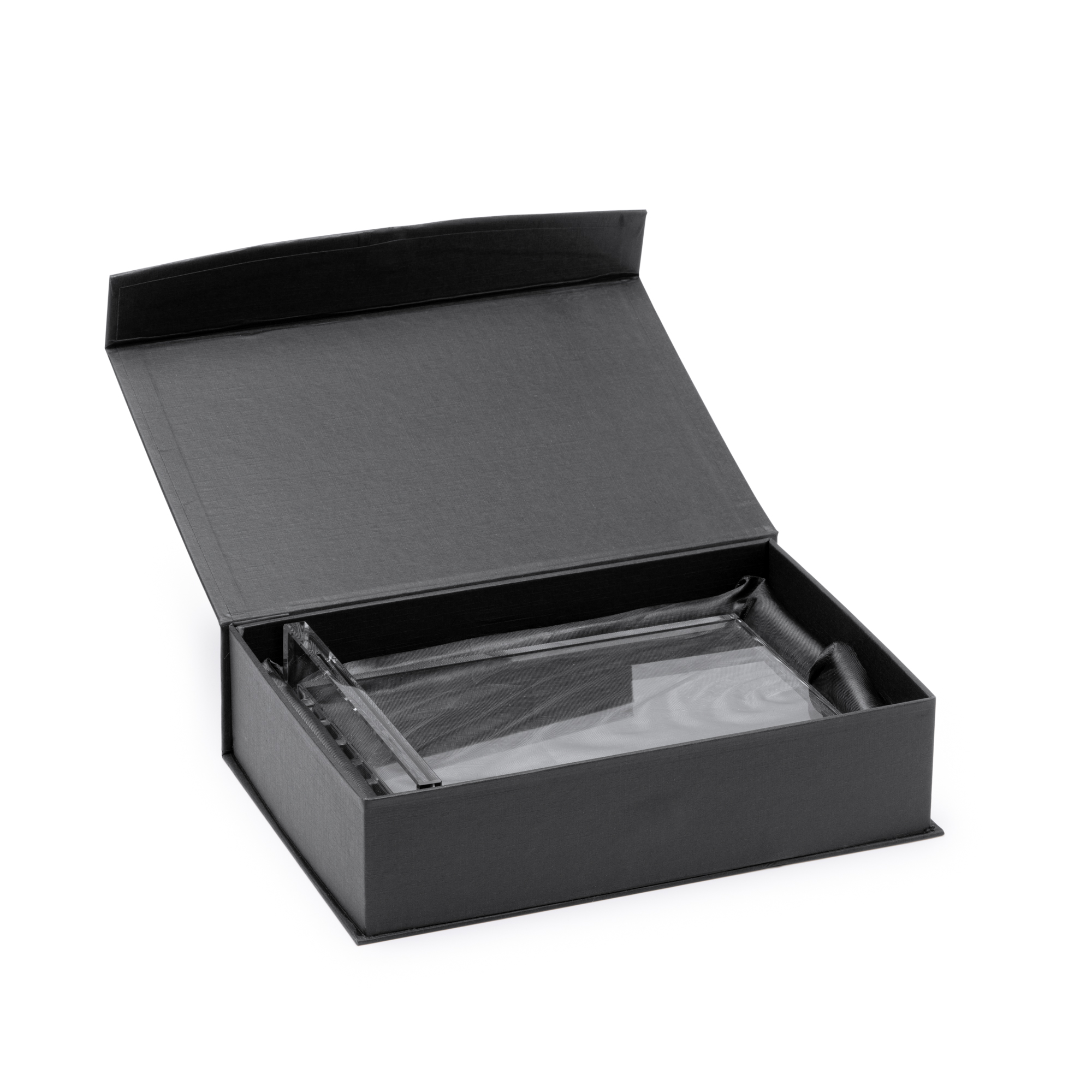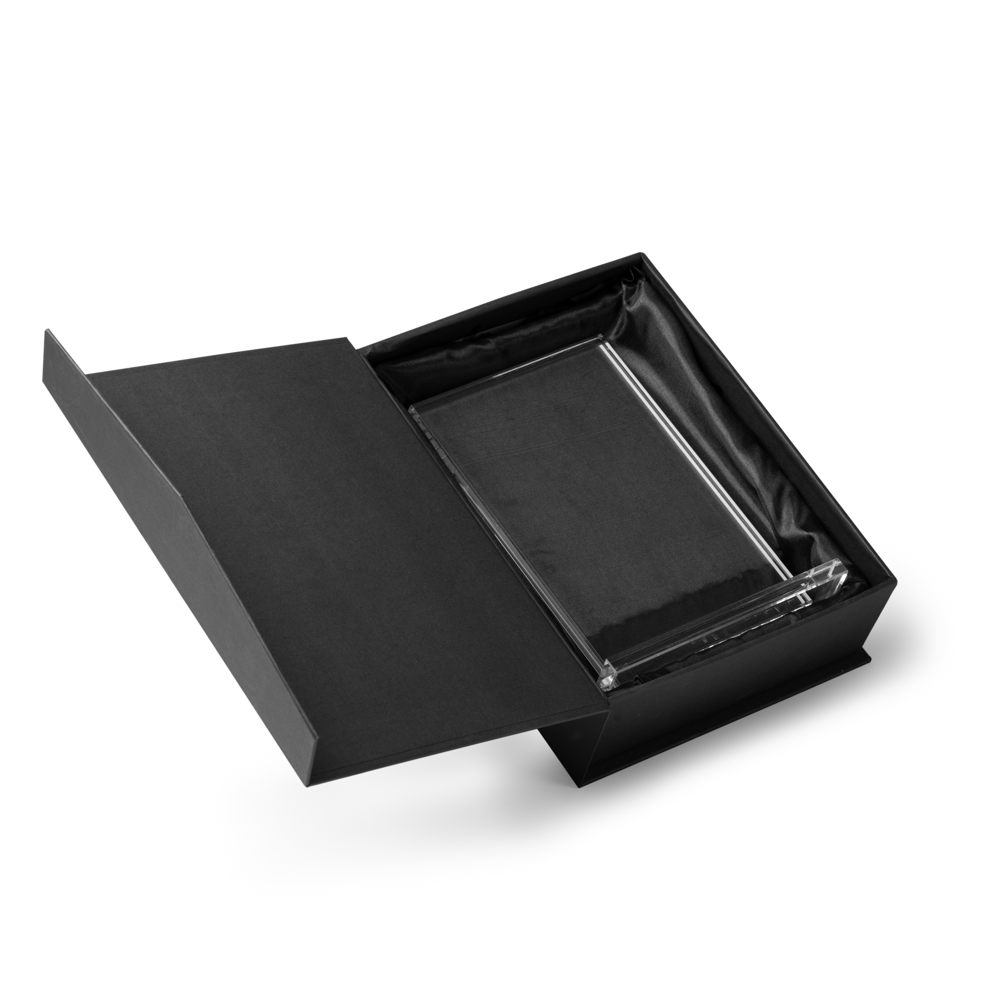 Стеклянная награда прямоугольной формы. Включает черный презентационный футляр.