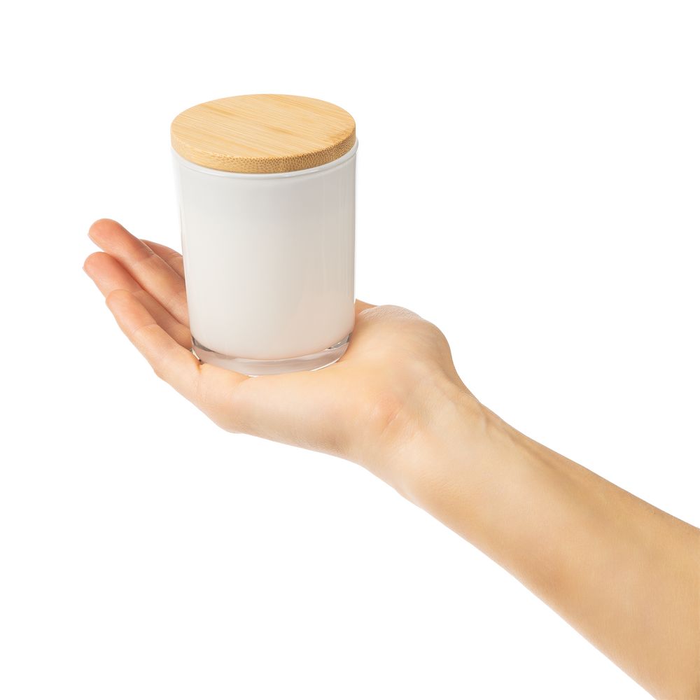 Материал: свеча - воск, кокосовый, парафин; подсвечник - стекло; крышка - дерево; фитиль - дерево