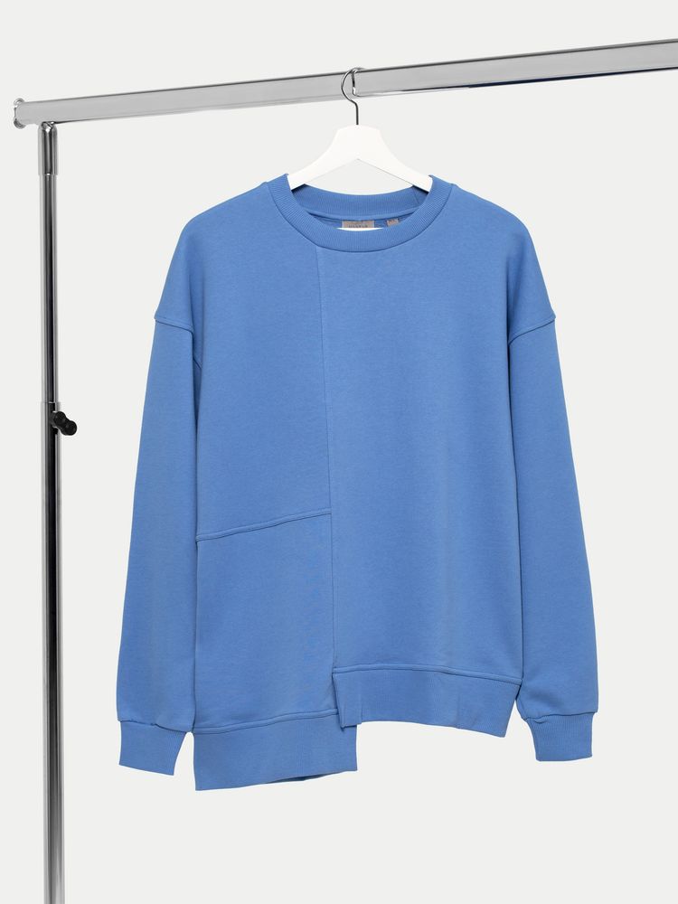 Свитшот унисекс свободного кроя со спущенным плечом и нестандартным нижним краем.