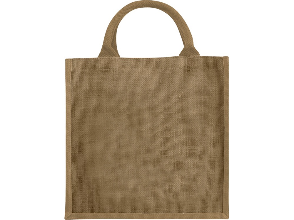 Джутовая подарочная сумка Chennai. Джутовая сумка с ламинированным открытым основным отделением и вставкой. Хлопковые ручки высотой 11,5 см. Джут.