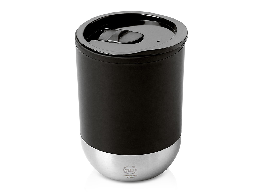 Термокружка с двойными стенками из переработанного полипропилена и дном из нержавеющей стали 304. В комплекте крышка-слайдер. Объём: 290 мл. Поставляется в экологичной коробке.