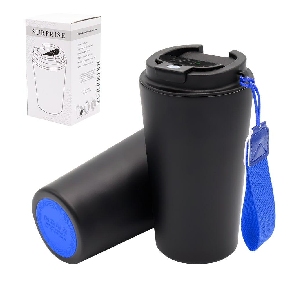 Компания «Эклектика BY» осуществляет нанесение логотипа на сувенирную продукцию: Термокружка Surprise To Go с индикатором, чёрная/синяя. Арт. 216877