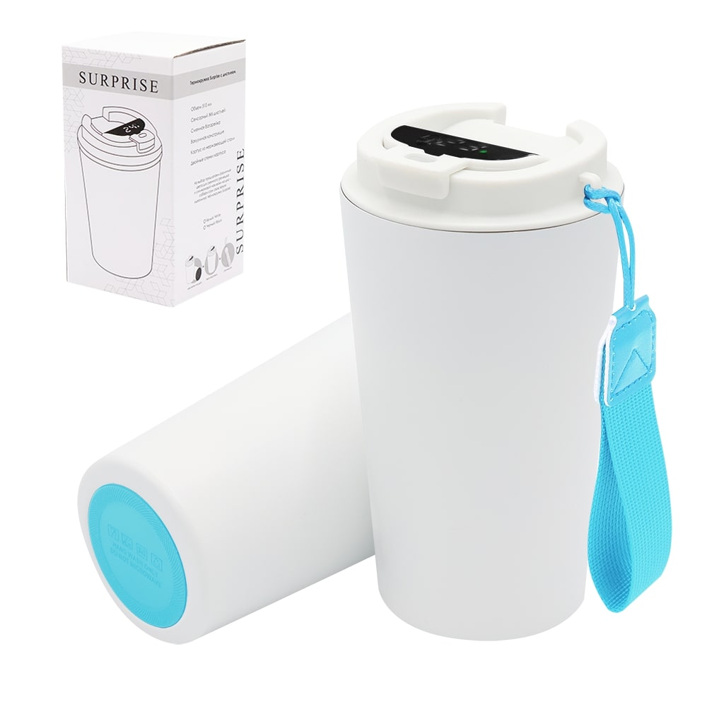 Термокружка Surprise To Go с индикатором, белая/бирюзовая с логотипом компании - отличный способ заявить вашу корпоративную идентичность.