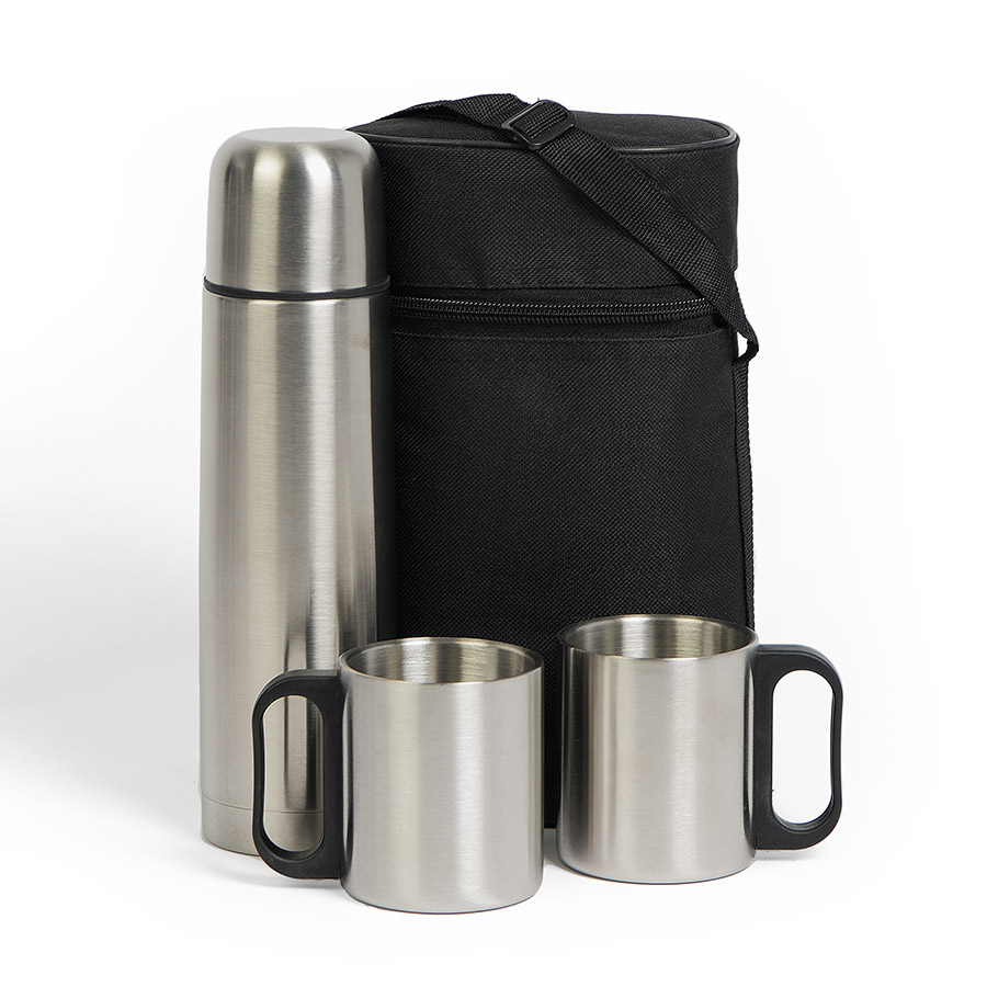 Универсальный набор с термосом на 0,5 литра и двумя металлическими кружками в удобном нейлоновом чехле с ручкой.
