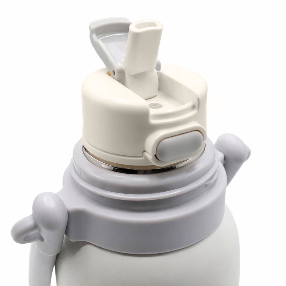 Конструкция крышки предусматривает две функции для питья. Первый вариант - через откидной носик, благодаря соломинке внутри термоса. Второй вариант - удобный порт под откидной крышкой (на кнопке). В нижней части крышки установлено сито, которое обеспечивает фильтрацию напитка. Верхная крышка (колпачок) - пластик (полипропилен).