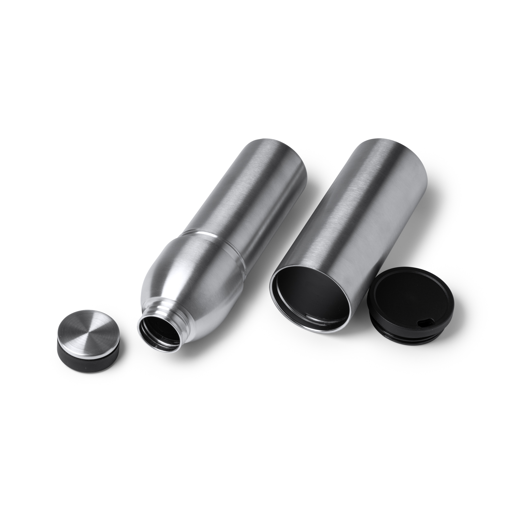 Бутылка-термос из нержавеющей стали. Емкость бутылки: 650 мл, емкость чашки: 500 мл.