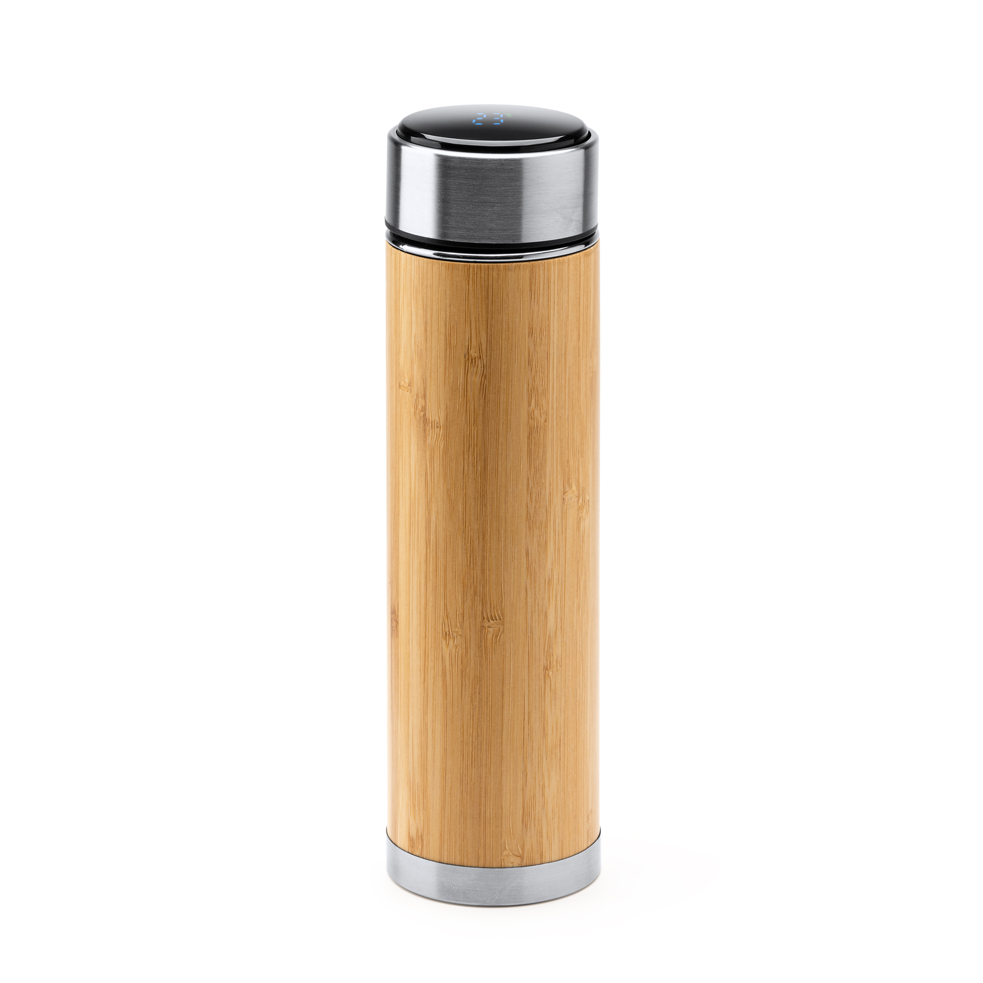 Термос с двойными стенками из нержавеющей стали 304 и бамбука, с заварочным устройством. Включает в себя цифровой сенсорный термометр на крышке для определения температуры вашего напитка, который идеально подходит для определения того, горячий или холодный ваш напиток. Емкость 480 мл.