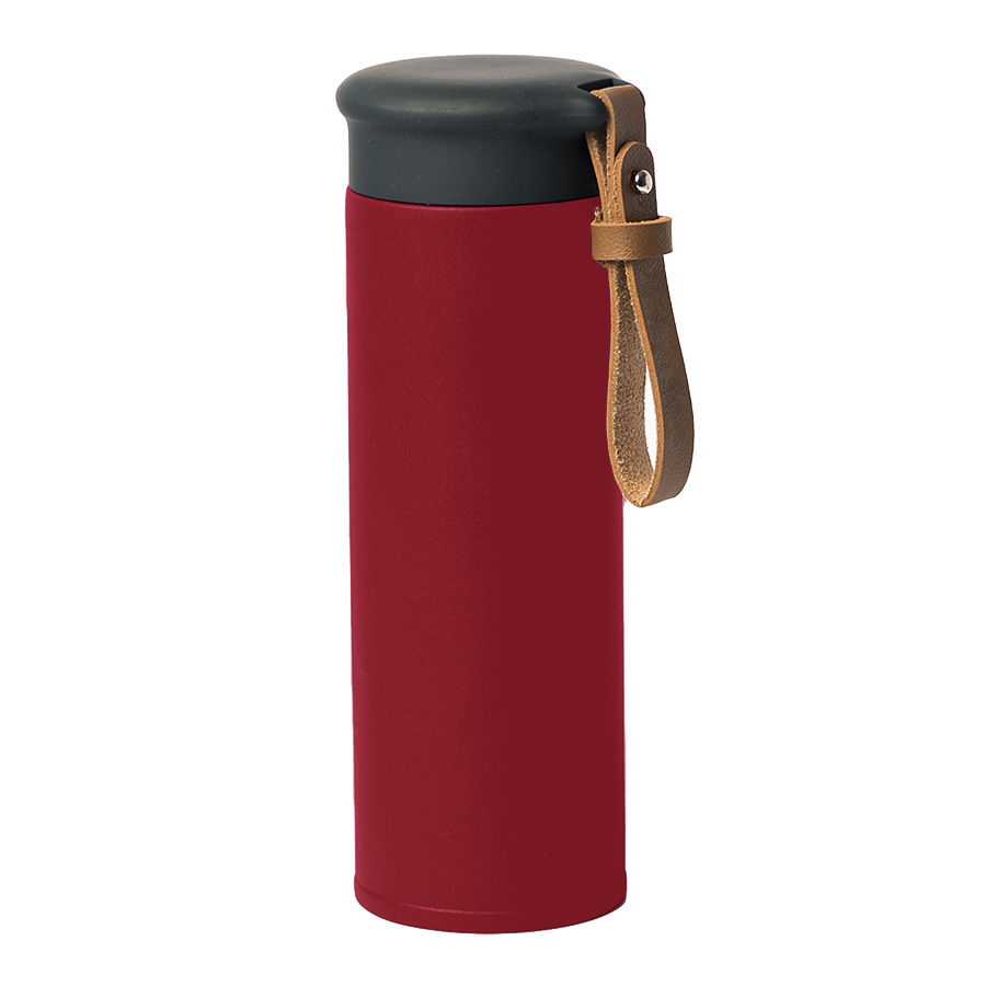 Вакуумный термос STRIPE с двойными стальными стенками Стильный матовый корпус термоса из нержавеющей стали (марка 304) Удобный ремешок из искусственной кожи, подходит для персонализации Герметичная крышка с покрытием soft-touch не даст напитку пролиться Цвет близкий к Pantone 200 C Индивидуальная упаковка из крафтового картона