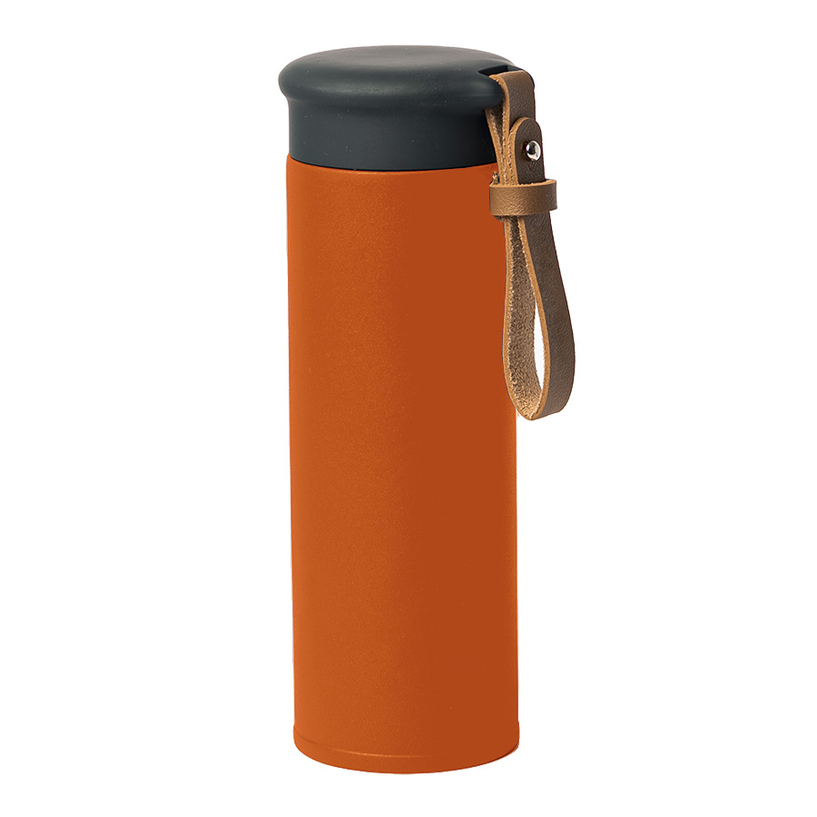 Вакуумный термос STRIPE с двойными стальными стенками Стильный матовый корпус термоса из нержавеющей стали (марка 304) Удобный ремешок из искусственной кожи, подходит для персонализации Герметичная крышка с покрытием soft-touch не даст напитку пролиться Цвет близкий к Pantone 021 C Индивидуальная упаковка из крафтового картона