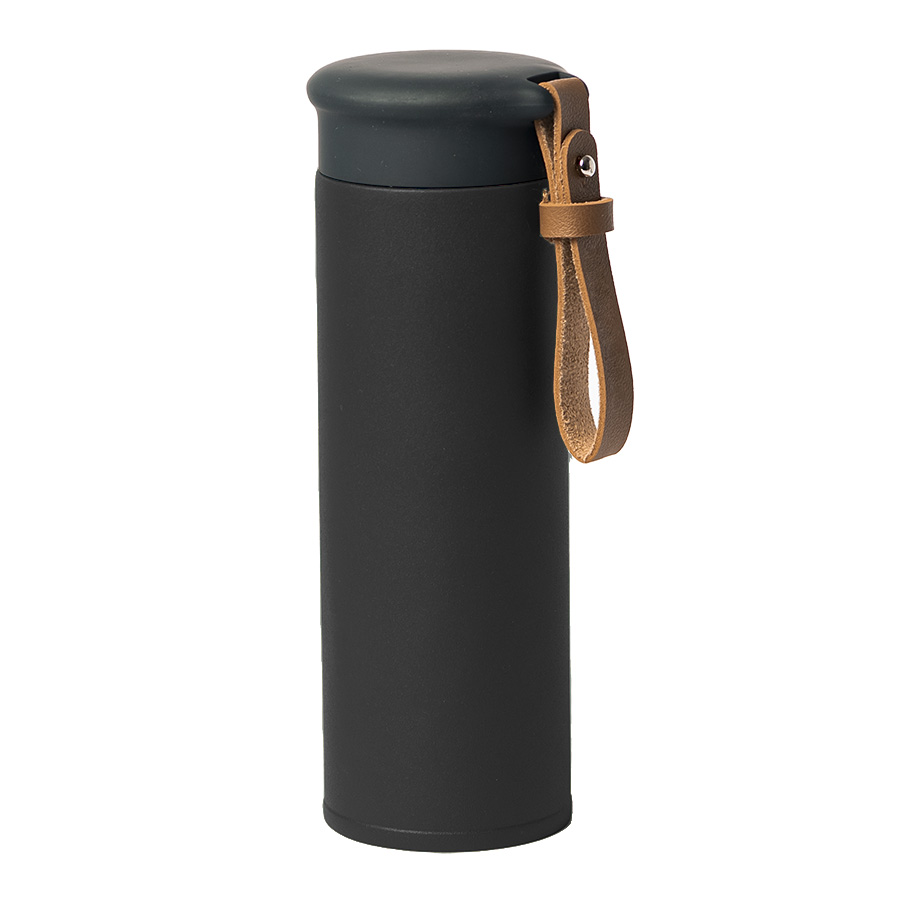 Вакуумный термос STRIPE с двойными стальными стенками Стильный матовый корпус термоса из нержавеющей стали (марка 304) Удобный ремешок из искусственной кожи, подходит для персонализации Герметичная крышка с покрытием soft-touch не даст напитку пролиться Индивидуальная упаковка из крафтового картона