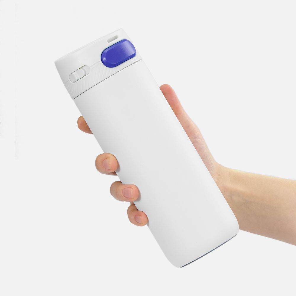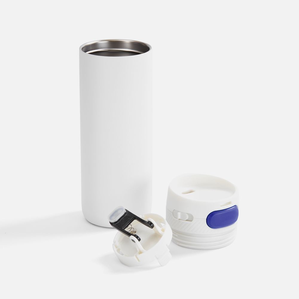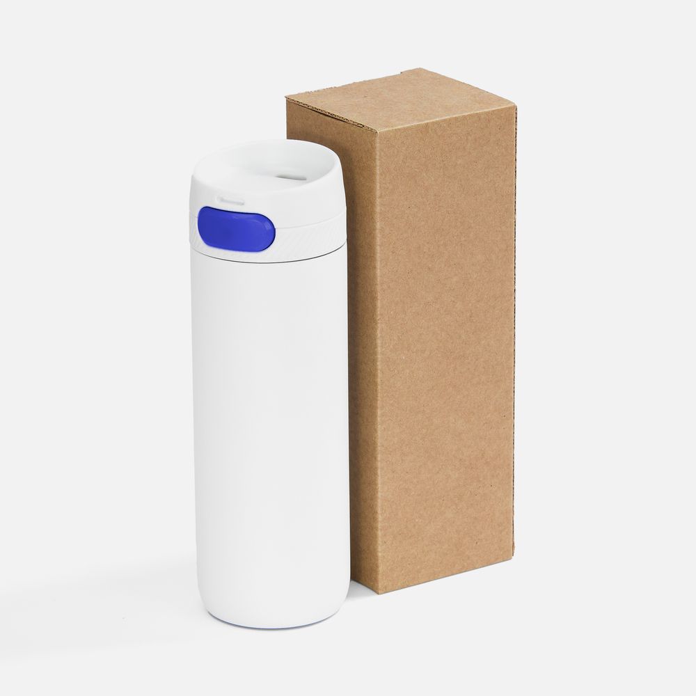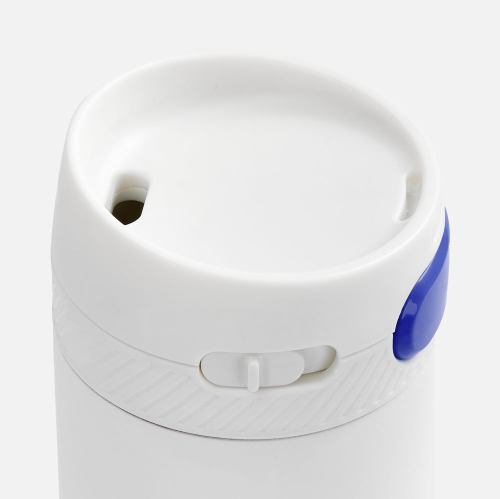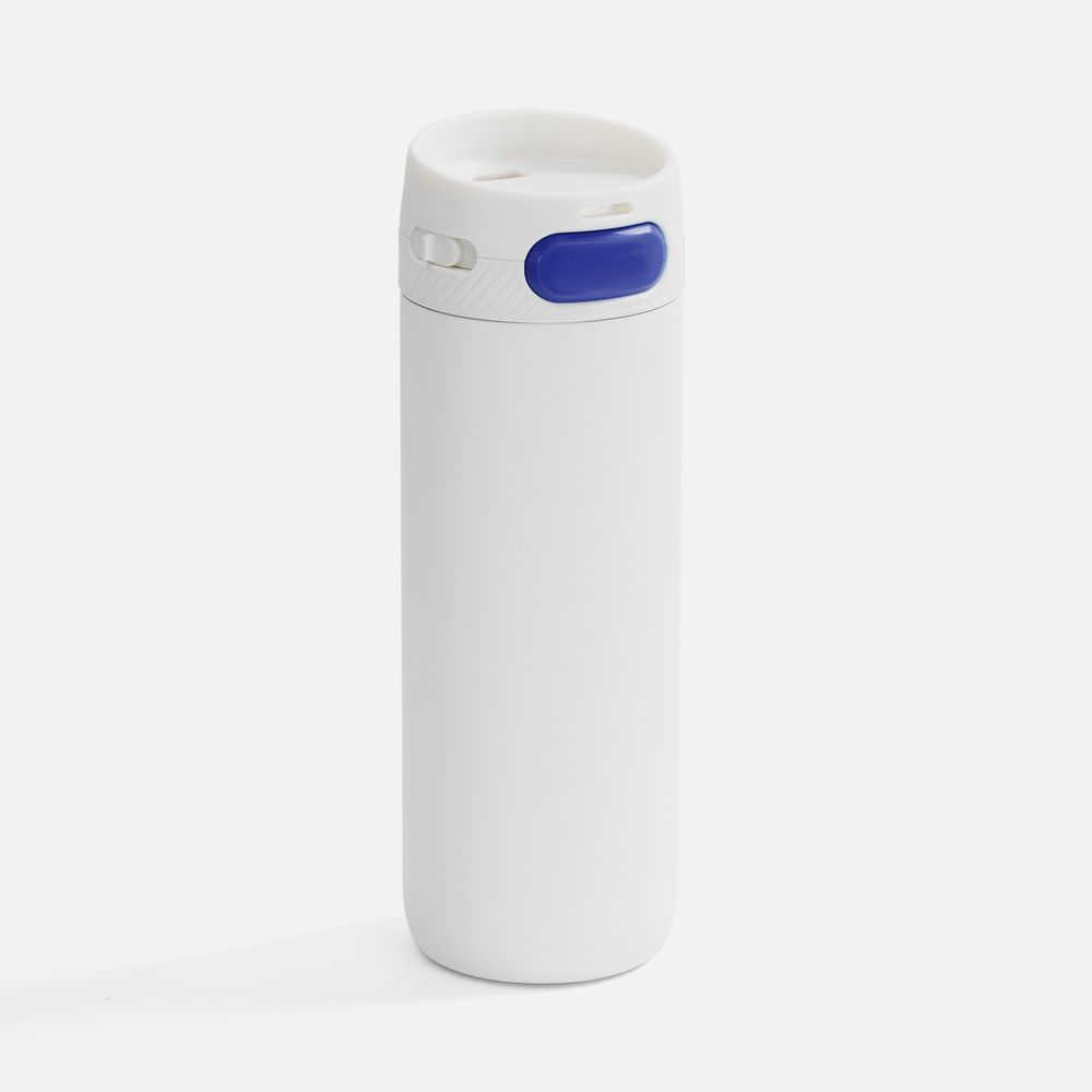 Главная ->Корпоративные подарки и рекламные сувениры на складе -> Термос и бутылка -> Термокружки -> Термостакан X1 с цветной кнопкой, белый с синим