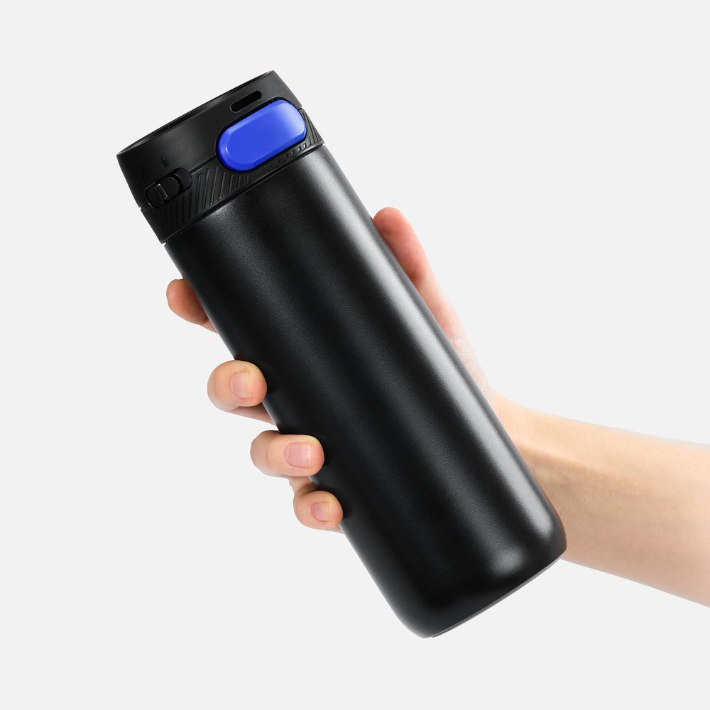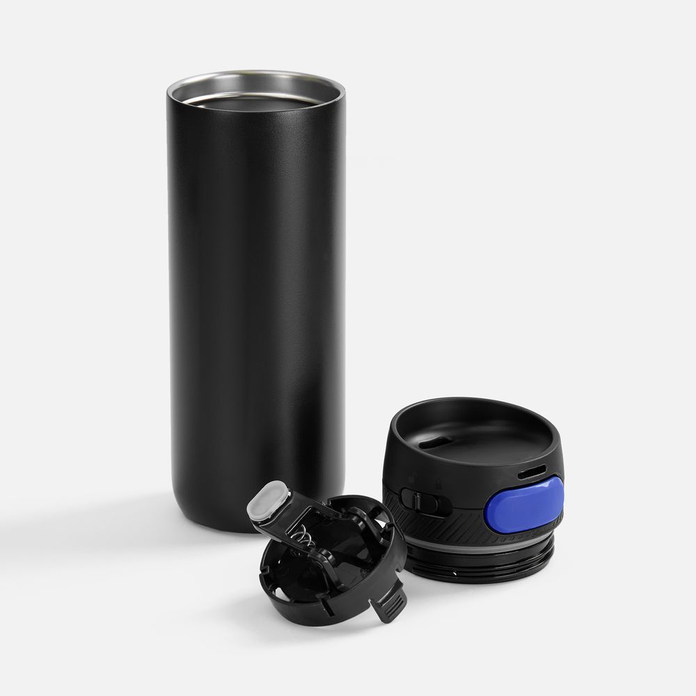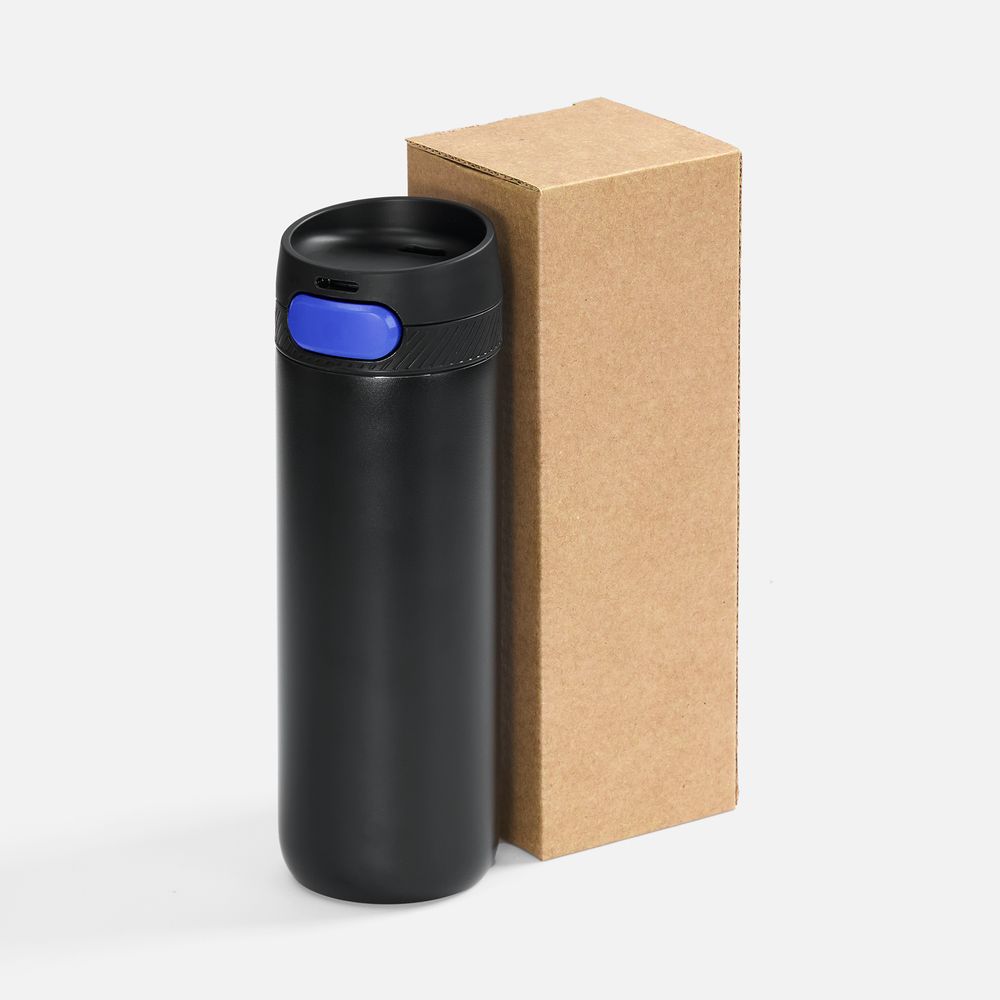 Главная ->Корпоративные подарки и рекламные сувениры на складе -> Термос и бутылка -> Термокружки -> Термостакан X1 с цветной кнопкой, черный с синим