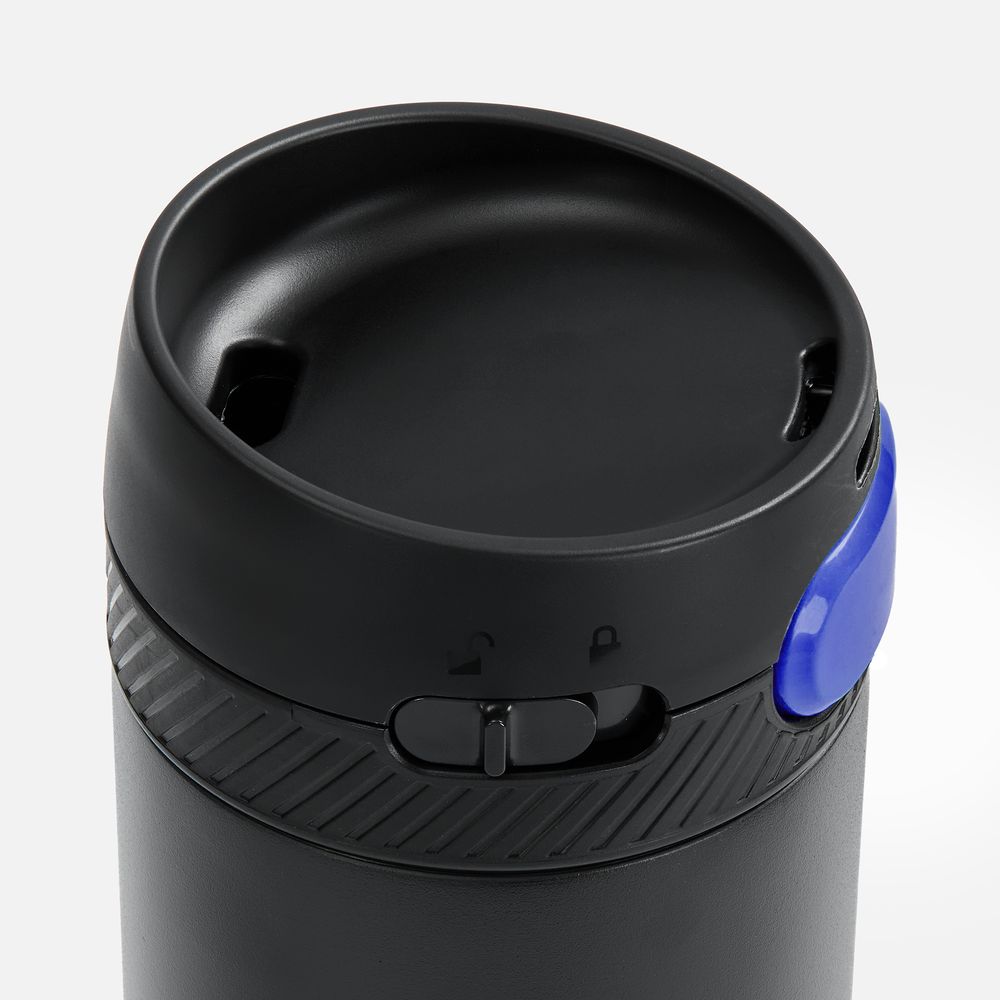 Термостакан X1 с цветной кнопкой, черный с синим с логотипом компании - отличный способ заявить вашу корпоративную идентичность.