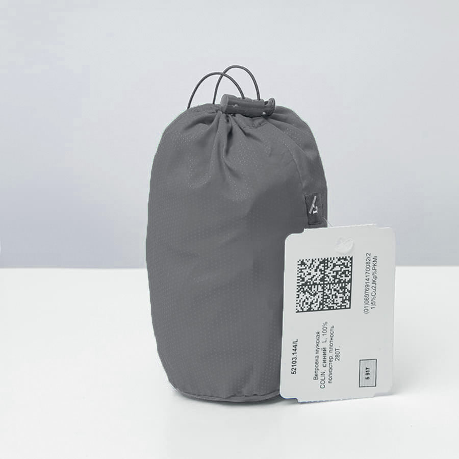 Несмотря на лаконичный дизайн, ветровки COLIN выгодно выделяются на фоне других промо-ветровок нанесенным на ткань микропринтом. Каждое изделие поставляется в сумке-футляре из основной ткани, на которой указан размер содержащегося в ней изделия, а также маркировка "Честный Знак".