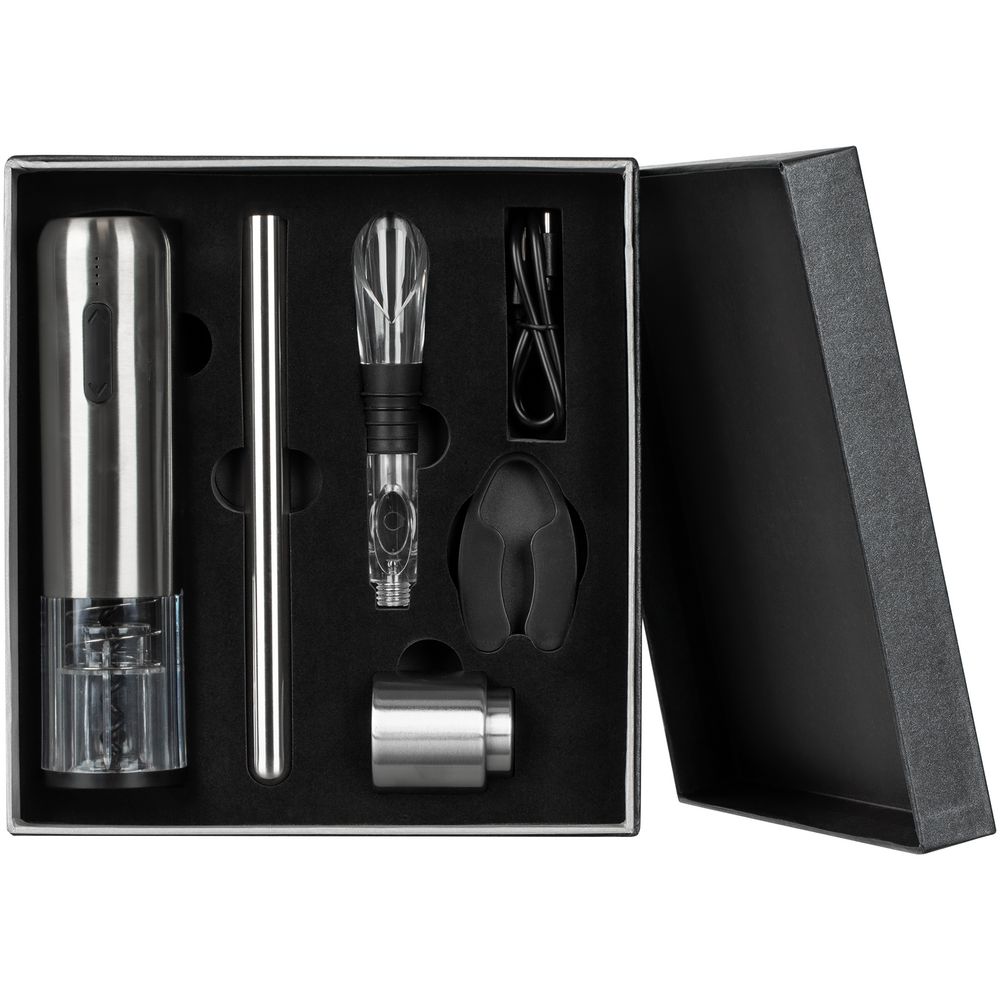 Винный набор Veritas, черный с серебристым с логотипом компании - отличный способ заявить вашу корпоративную идентичность.