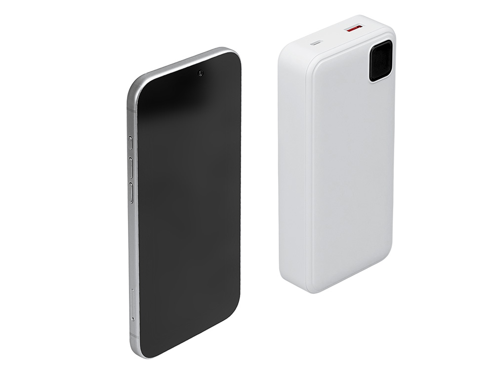 Компания «Эклектика BY» осуществляет нанесение логотипа на сувенирную продукцию: Внешний аккумулятор со встроенными кабелями Фрэйм Про, быстрая зарядка, 20000мач, белый. Арт. 459746