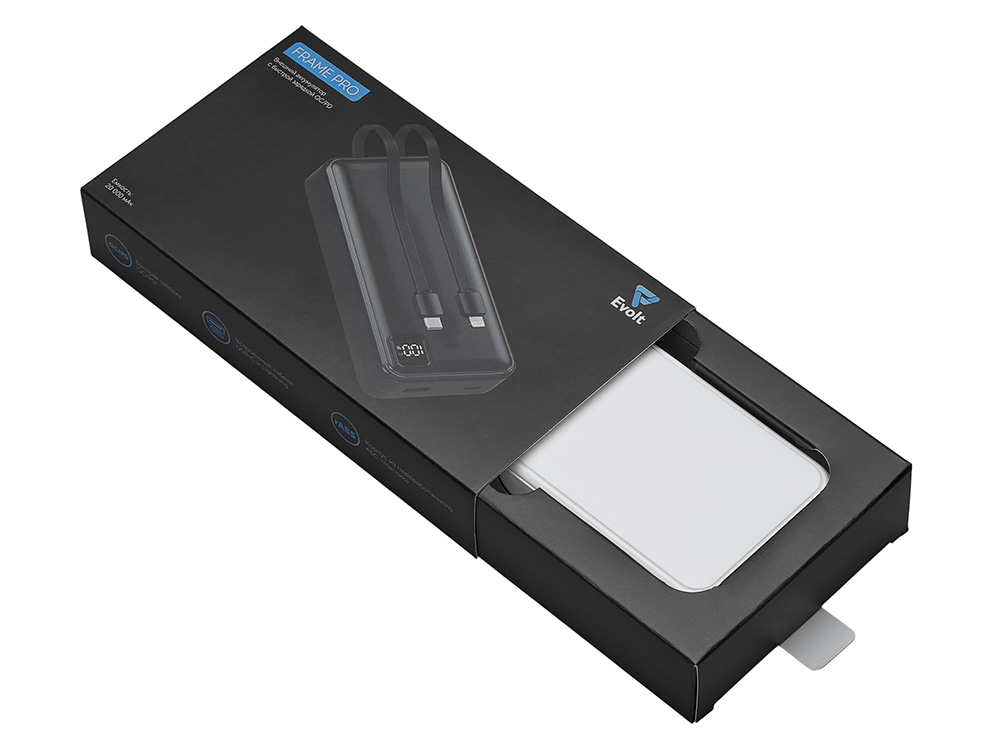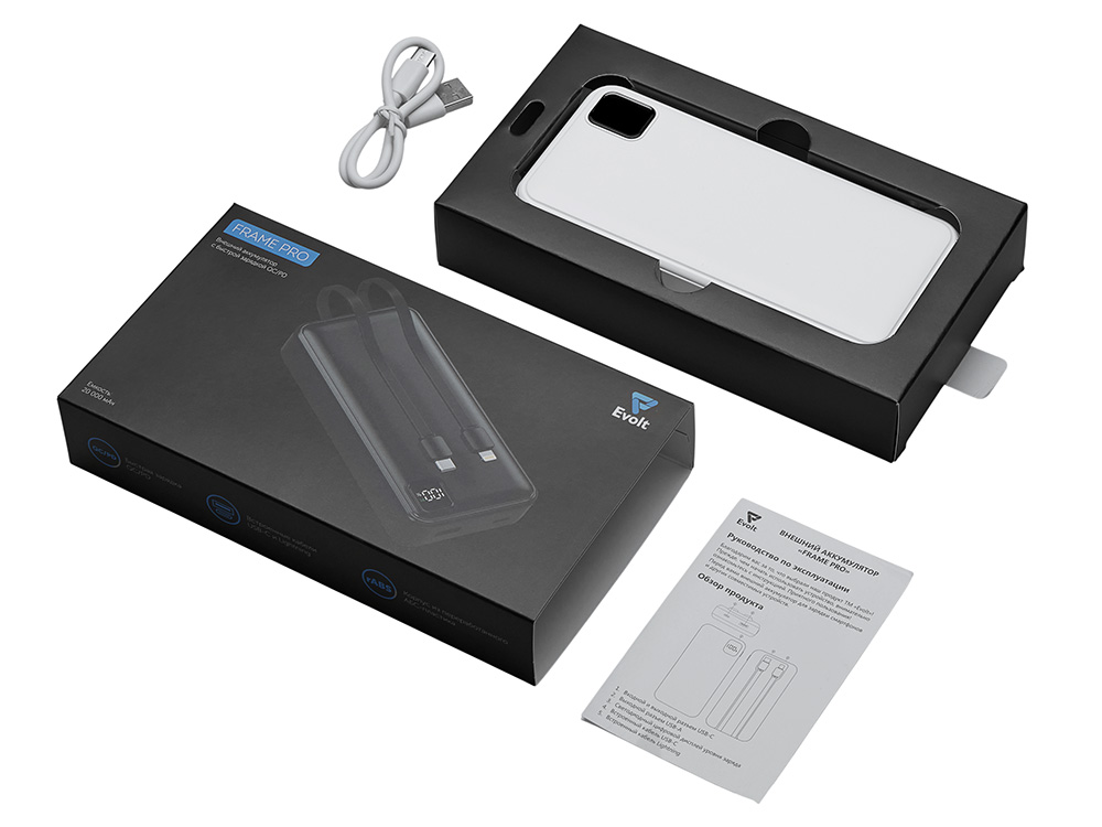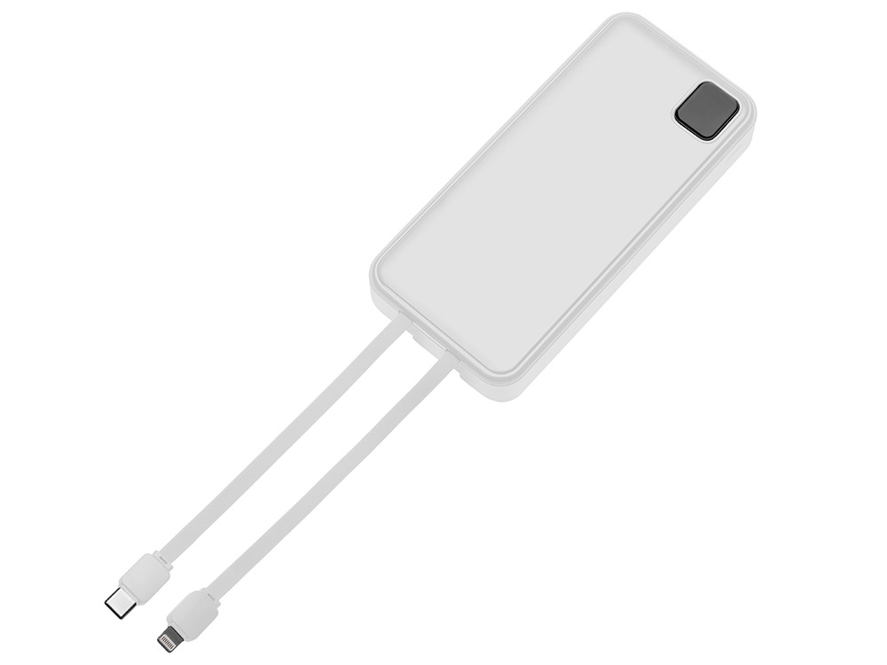 Внешний аккумулятор со встроенными кабелями Фрэйм Про, быстрая зарядка, 20000мач, белый с логотипом компании - отличный способ заявить вашу корпоративную идентичность.