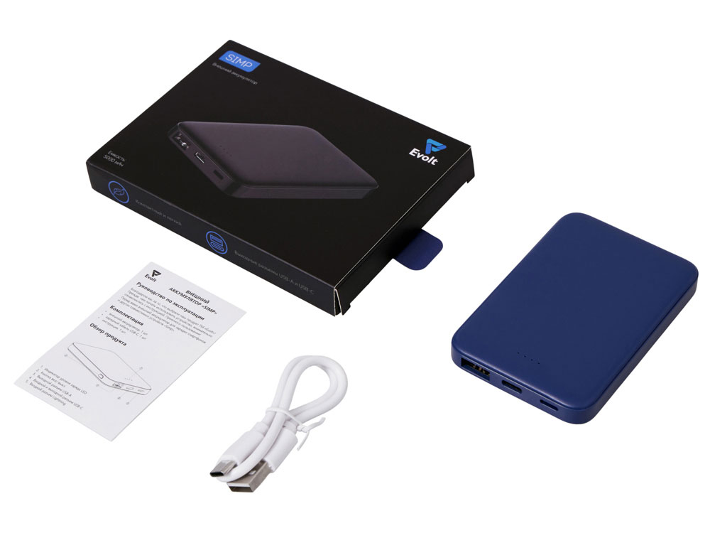 Компания «Эклектика BY» осуществляет нанесение логотипа на сувенирную продукцию: Внешний аккумулятор Simp, 5000 мАч, темно-синий. Арт. 448827