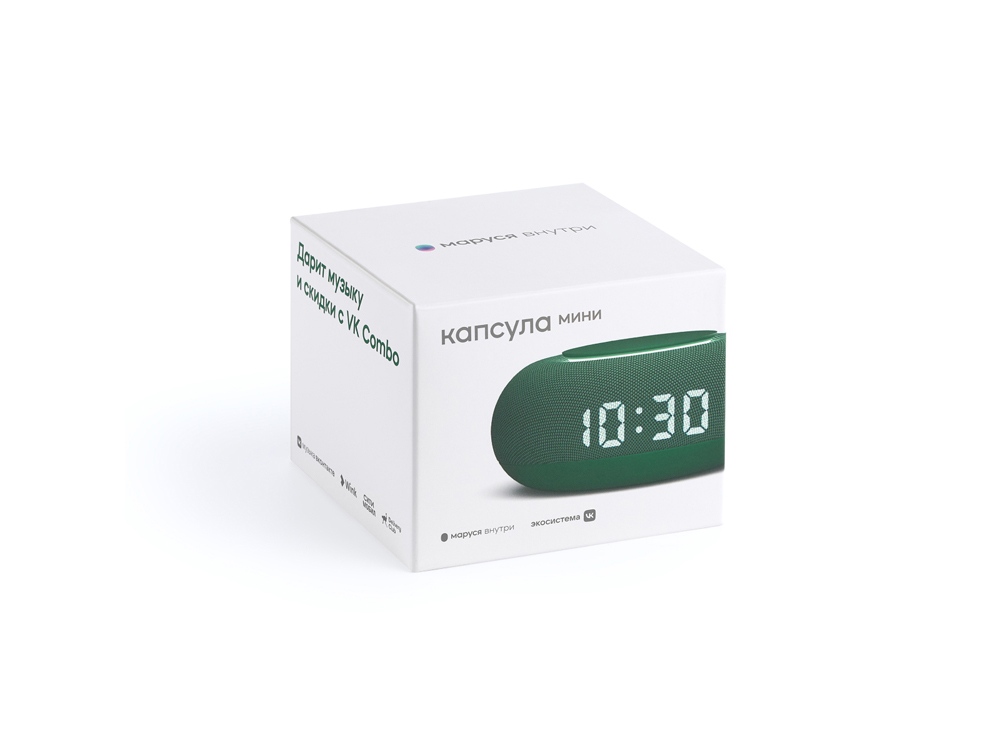 Компания «Эклектика BY» осуществляет нанесение логотипа на сувенирную продукцию: Умная колонка VK Капсула Мини с голосовым помощником Марусей, хвойный зеленый. Арт. 426762