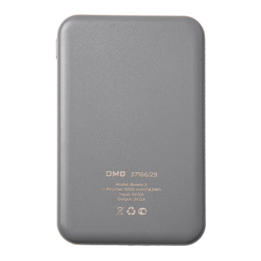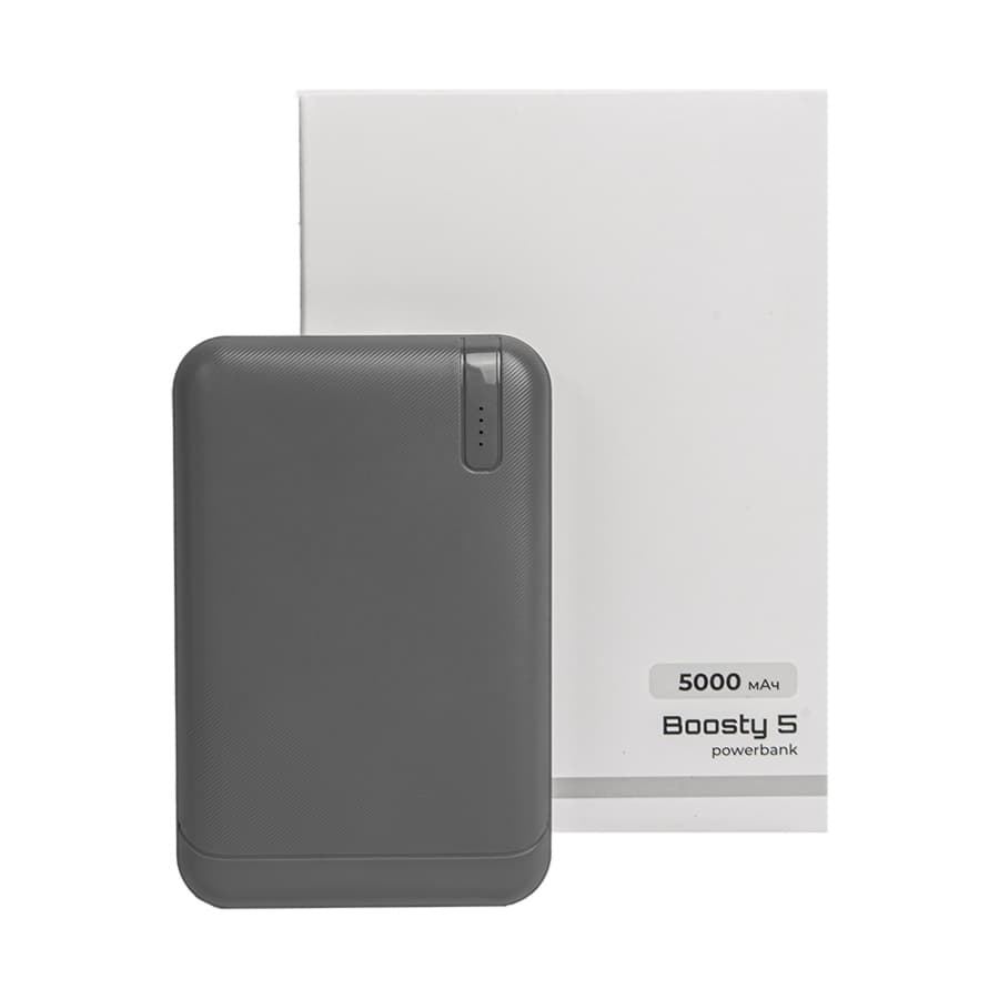 Универсальный аккумулятор Boosty 5 (5000 мАч), серый, 9,8х6.3х1,4 см с логотипом компании - отличный способ заявить вашу корпоративную идентичность.
