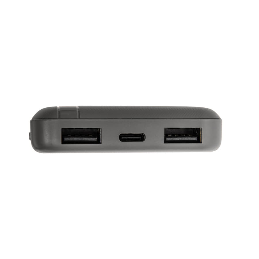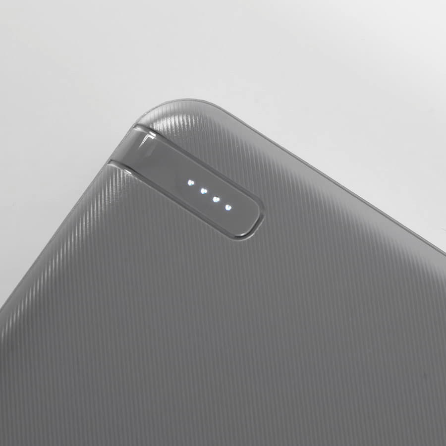 Внешний аккумулятор имеет пластиковый матовый корпус. Пауэрбанк заряжается через универсальный порт Type-C и отдает энергию через два классических порта USB. Благодаря встроенному в корпус индикатору уровня заряда батареи, удобно следить за расходом батареи.