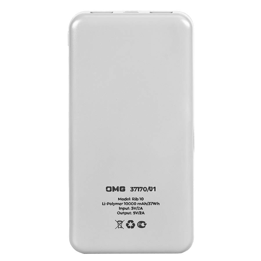 Универсальный аккумулятор Rib 10 (10000 мАч), белый, 13,5х6.8х1,5 см с логотипом компании - отличный способ заявить вашу корпоративную идентичность.