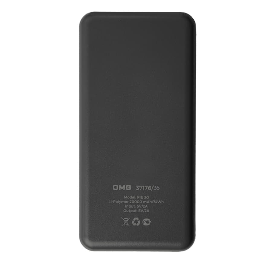 Главная ->Корпоративные подарки и рекламные сувениры на складе -> Сувенирная электроника -> Зарядные устройства Power Bank -> Универсальный аккумулятор Rib 20 (20000 мАч), черный, 14,1х6.9х2,8 см