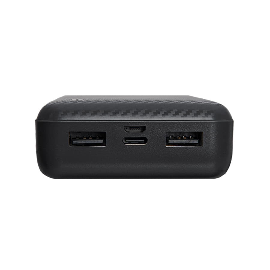 Внешний аккумулятор имеет пластиковый матовый корпус. Пауэрбанк заряжается через универсальный порт Type C или Micro-USB и отдает энергию через два классических порта USB. Благодаря встроенному в корпус индикатору уровня заряда батареи, удобно следить за расходом батареи.