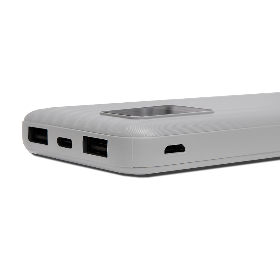 Внешний аккумулятор имеет пластиковый матовый корпус с ЖК-дисплеем, который покажет оставшийся уровень заряда в любой момент. Пауэрбанк заряжается через универсальный порт Type-C или Micro-USB и отдает энергию через два классических порта USB. Благодаря встроенному в корпус дисплею, следить за расходом батареи стало удобнее. Заряд показывается в процентах.